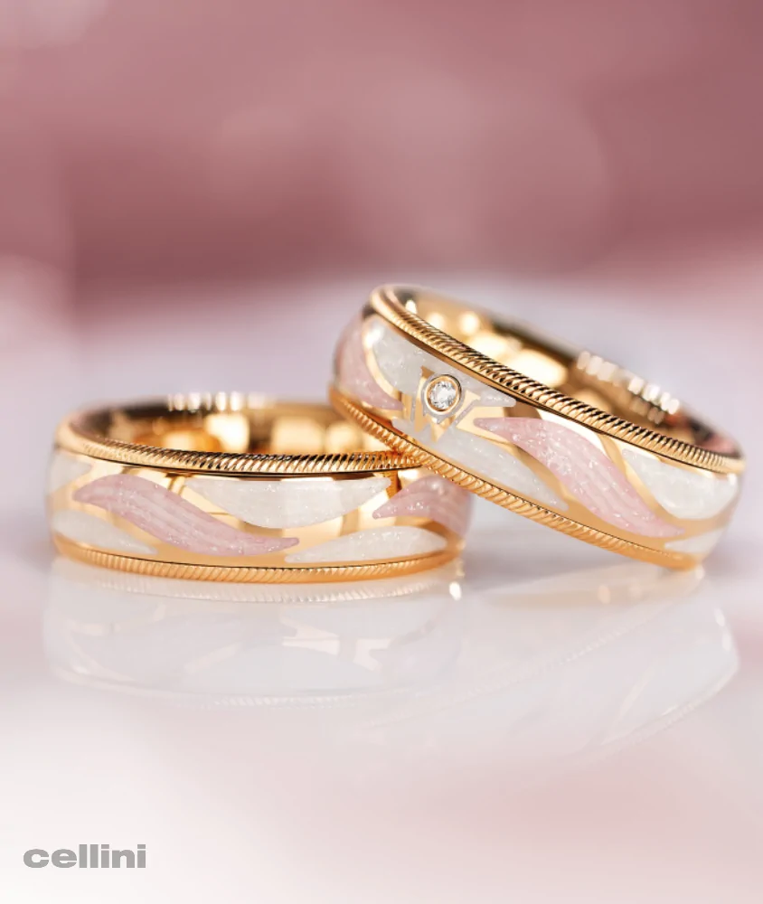 The stylised angel wings flow dynamically around the ring, catching the light from different angles. In a play of light and movement, the pattern changes again and again when gently spun.