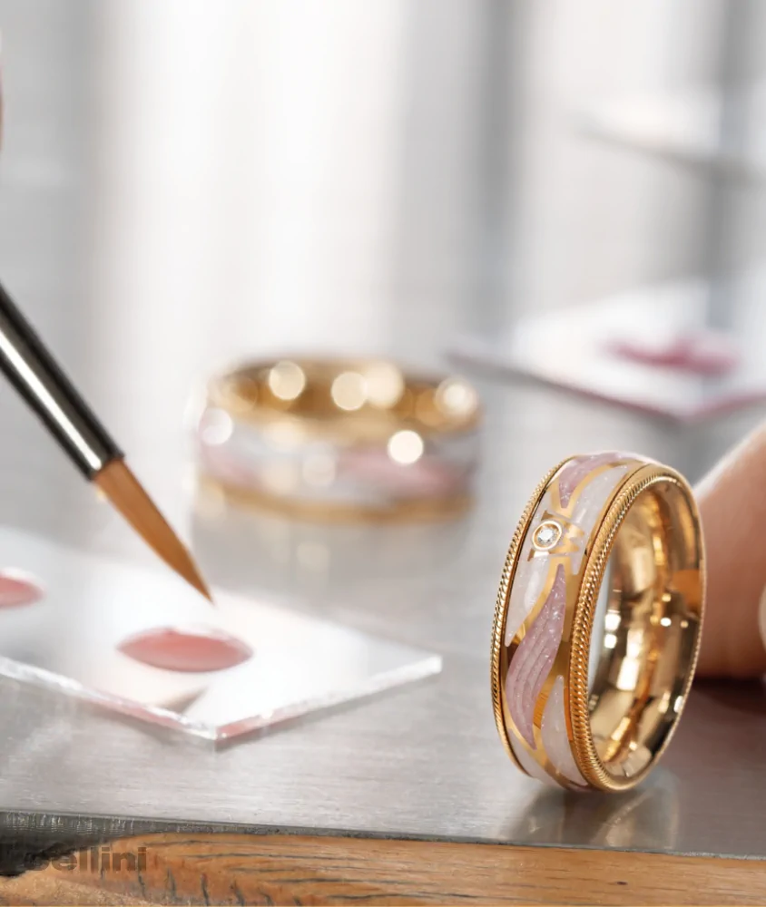 The iridescent cold enamel colours are skilfully applied by hand to each plane: a shimmering mother-of-pearl white and a delicate nude, sprinkled with sparkling stardust.