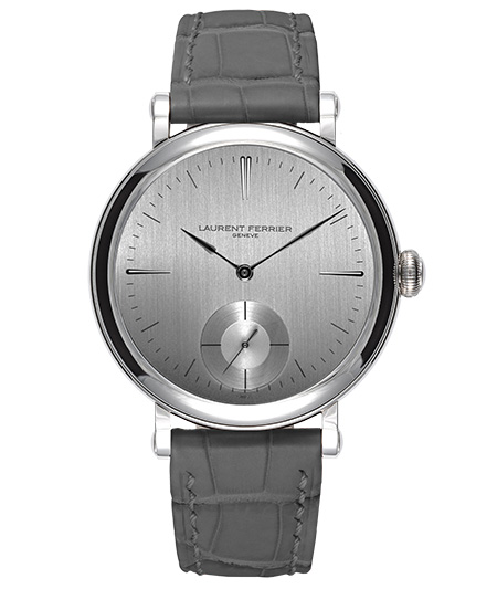 Galet Micro Rotor “Montre Ecole” Steel: This new case demanded a new dial, also inspired by the Laurent Ferrier School Piece “Montre Ecole” with a vertical satin-brushed finish in a dark silver hue. Assegai-shaped white gold hands and indexes point to anthracite painted indexes. The minimalist small seconds dial, free of clutter, enjoys two contracting surfaces: a snailed finish in the center and a sandblasted outer section. Another nod to classicism is the finish of the main bridge, reminiscent of the “frosted” style of the great English watchmakers of the 18th century. Laurent Ferrier also chose a rougher decoration for its micro rotor movement, recalling the original materials uses in prototyping, such as brass, which offers a contrast with steel. Further hand-finishing skills applied to the movement include shot-blasting, known as microbillé, and mirror polishing for the parts in steel, including the balance cock.