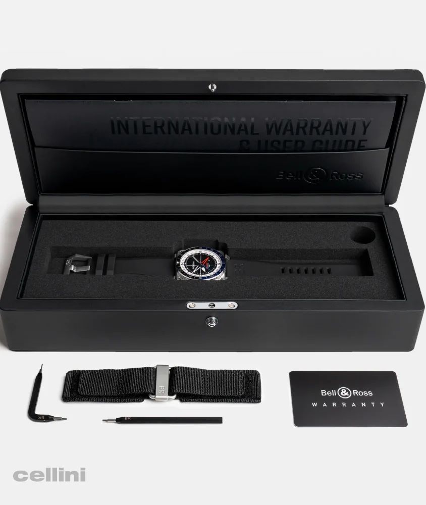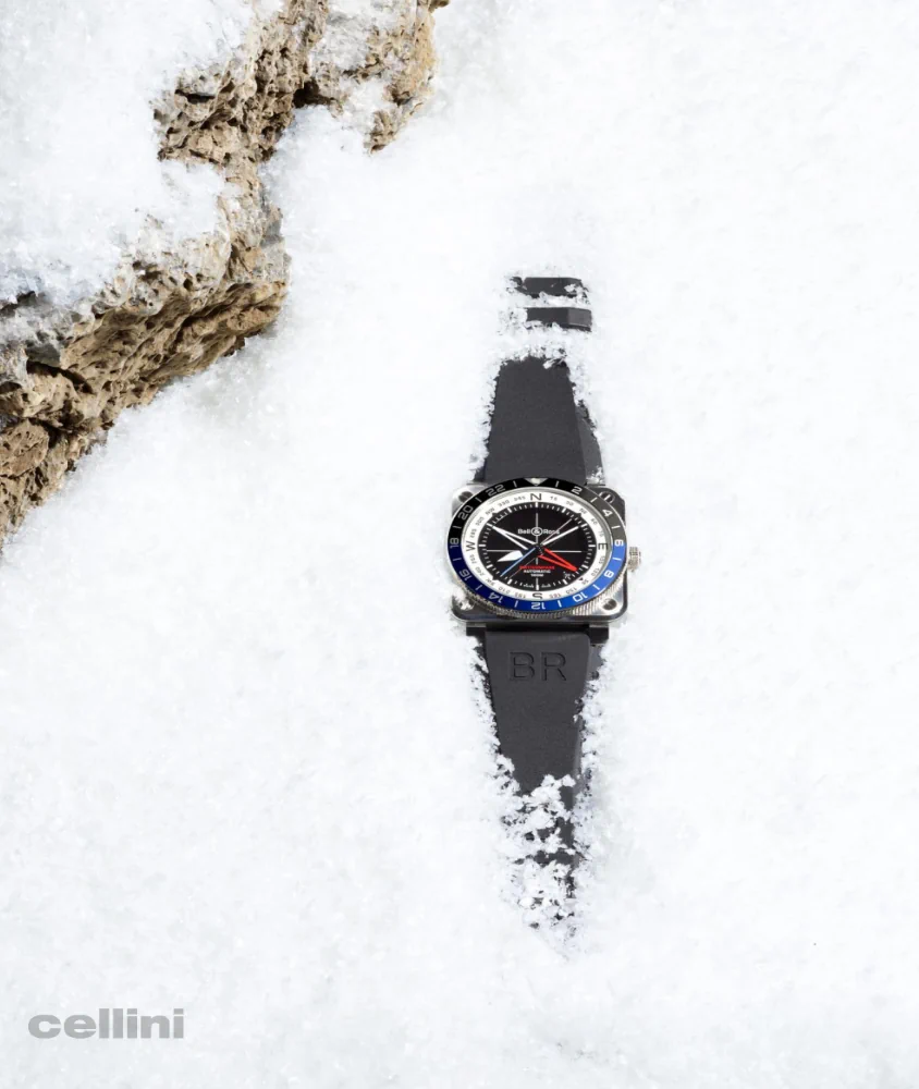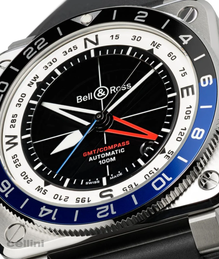 The BR-03 GMT Compass dial serves a true navigational function. On a sunny day, you can easily use your watch to find direction, thanks to the combination of the compass rose graduation and the 24-hour GMT hand indicating the second time zone. This GMT hand is diamond-shaped — just like a traditional magnetic compass needle. The four cardinal points (North, South, East, West) are marked on the flange at 6h, 12h, 18h, and 24h. To determine direction using the sun’s position (as in an orienteering course), simply lay the watch flat and parallel to the ground. Start by setting the GMT hand to solar time. For example, in summer in Geneva, solar time is two hours behind official time — when it’s 2 p.m. officially, it’s only noon by the sun. Then, point the red hand toward the sun, and you’ll be able to read your direction on the dial’s graduated scale.