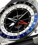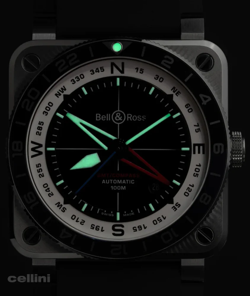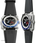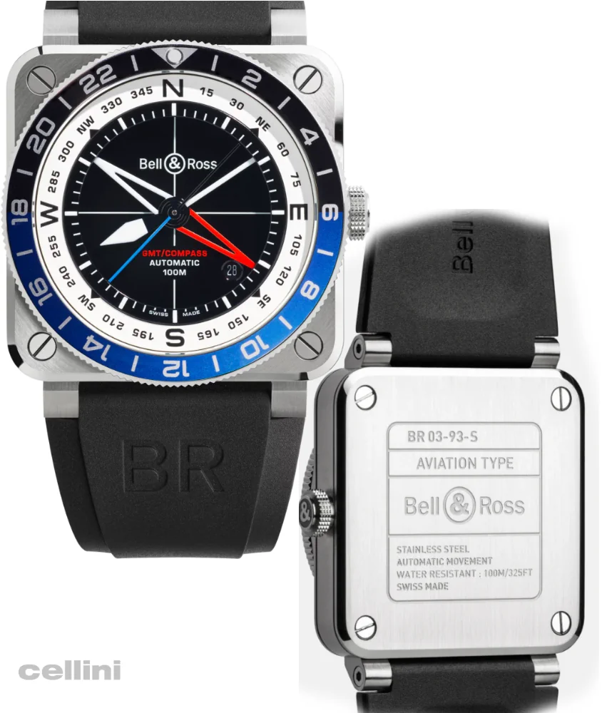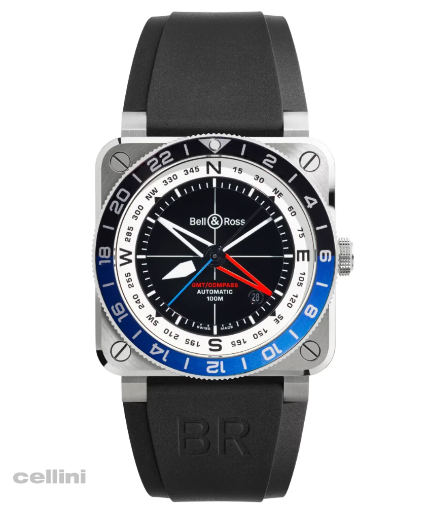 The BR-03 GMT Compass, capable of indicating direction thanks to its two-tone bezel and compass-style graduated dial, helps you find your way not only through time, but also through space. It is water-resistant to 100 meters and features a 24-hour graduated anodized aluminum bezel. The blue section displays daytime hours, while the black segment indicates nighttime hours. The bezel is mounted on a 42 mm square stainless-steel case and can be worn with either a rubber strap or a Velcro fastening. Inside beats a BR-CAL.303 automatic mechanical movement offering a 54-hour power reserve.
