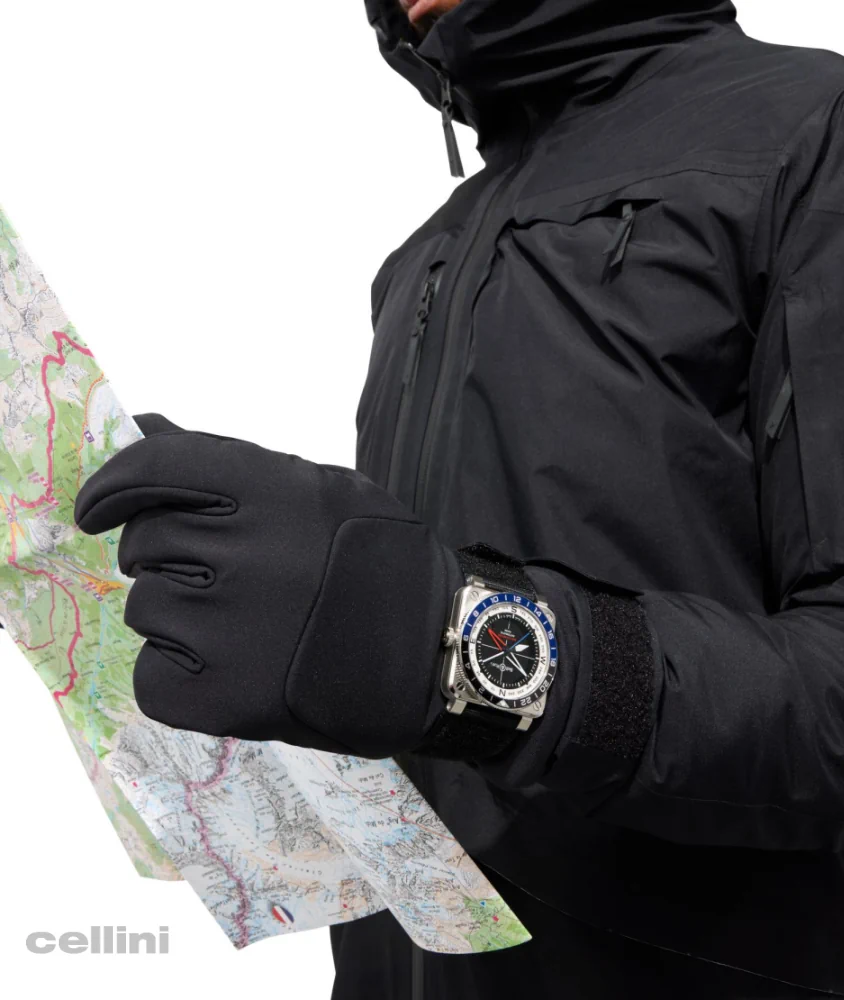 - Dial: : Black dial with flange under the crystal with cardinal points and minute track. Black hour and minute hands filled with white Super-LumiNova® X1 with a green glow. Black and blue second hand. Red and white two-color GMT hand with twin arrows.