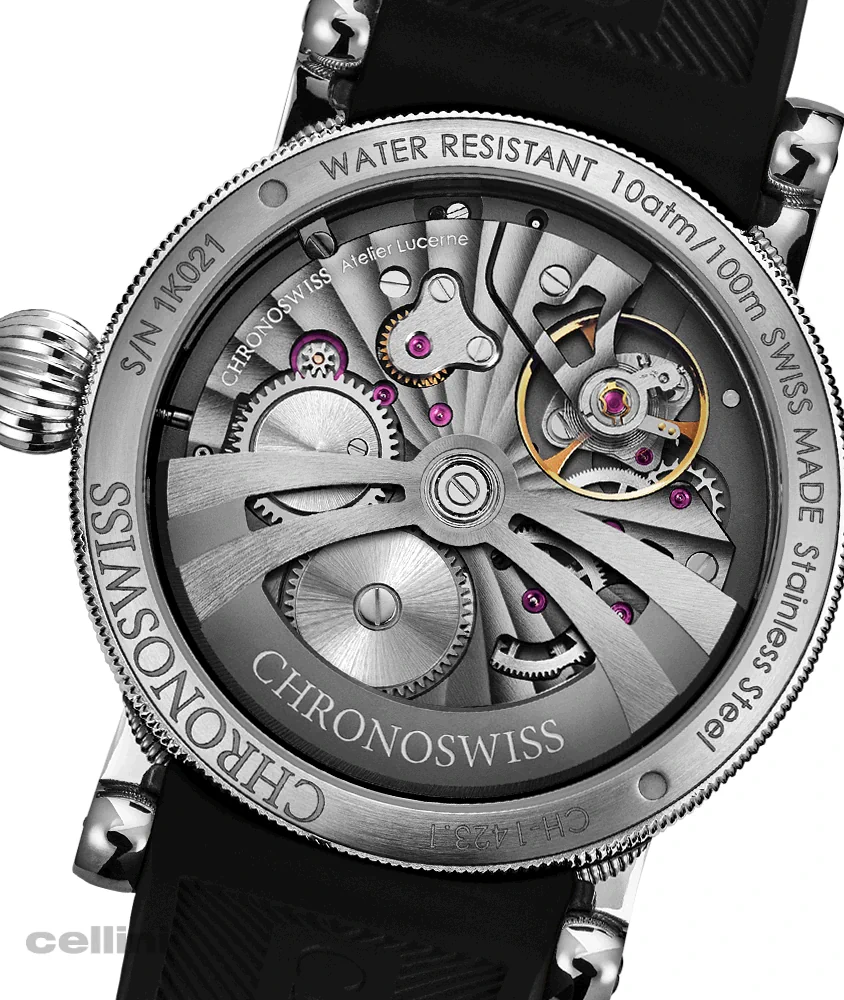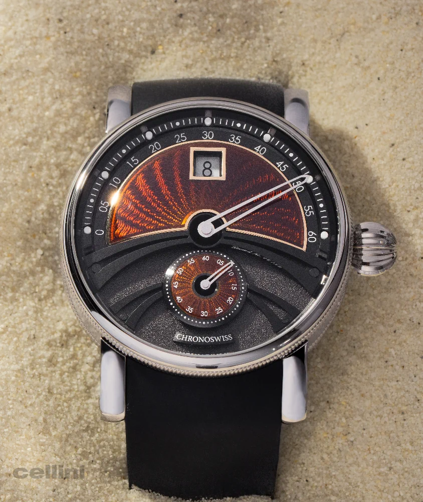 This stunning dial is paired with Chronoswiss’s signature jumping hour mechanism, prominently displayed at 12 o’clock. A retrograde minute hand, sweeping gracefully across the upper half of the dial, completes the iconic design.
