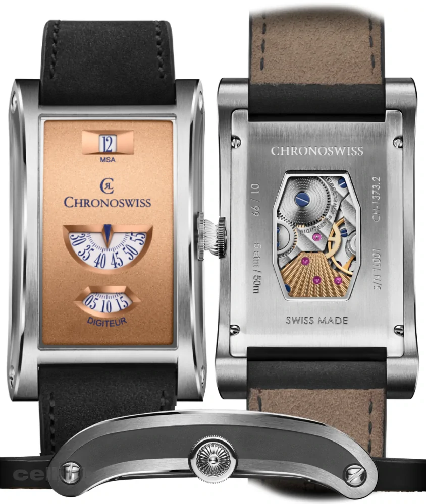 The Neo Digiteur case is a bold, architectural, tailored rectangular barrel-shaped silhouette. At its heart lies a rare mechanical concept: a jumping hour regulator without hands. Time is displayed through three crisply cut apertures. The jumping hour at 12 o’clock, digital minutes at center, and running seconds in a horizontal window at 6 o’clock. Together, they form a mechanical digital regulator. Powering the display is the new hand-wound Chronoswiss Caliber C.85757 – a tribute to the original Chronoswiss postal code from 1983. Beating at 3 Hz and offering a 48-hour power reserve. Water resistance is rated to 5 ATM.