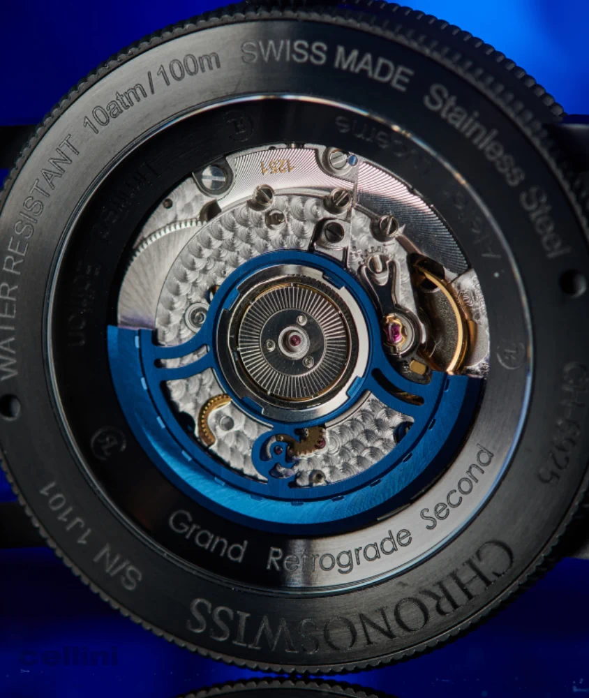 - Movement: Chronoswiss caliber C. 301, automatic, with stop seconds