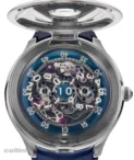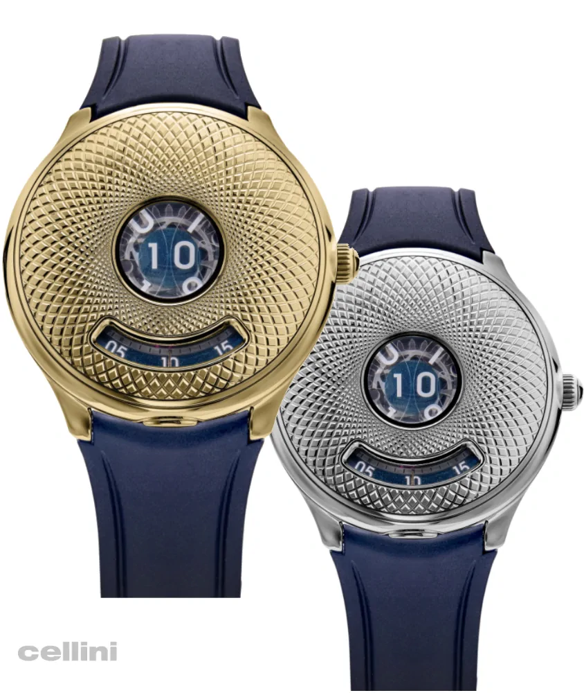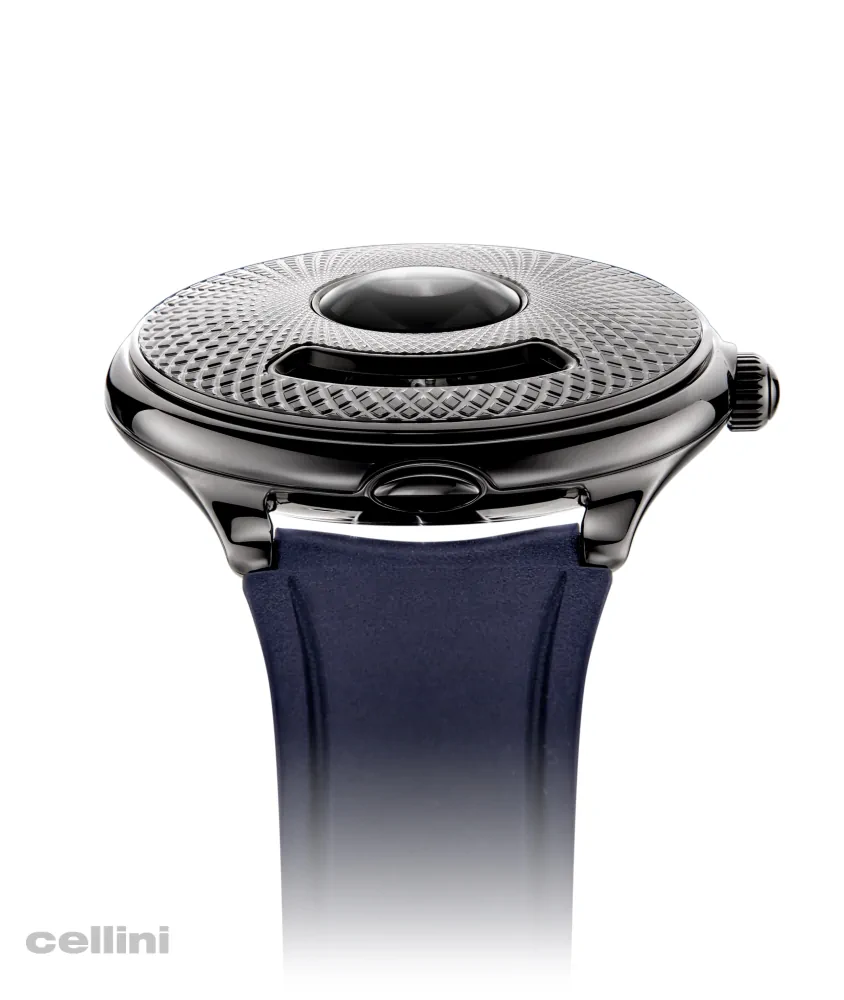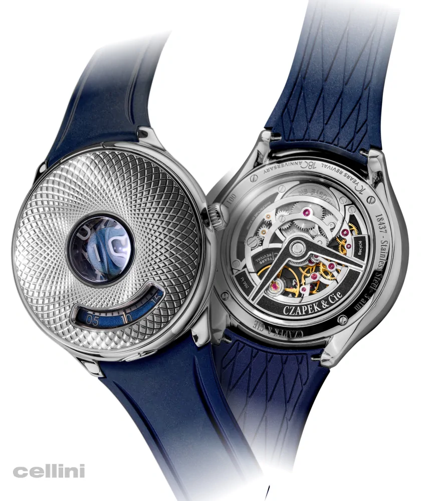 Reimagining the pocket watches created by François Czapek in the 19th century, the watch is centred on a jumping hour complication displaying 24 hours on two discs and complemented by trailing minutes on a peripheral ring. On the half-hunter cover, a new, three dimensional guilloché pattern creates the optical illusion of a black hole, taking the form of a loupe in the centre that reveals the open-worked complication.