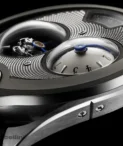 - Case: Secret and retractable crown, unlocking via pressure. 3 positions: neutral, reset, and winding• Titanium dial decorated with «Pointe du Risoux» guilloché• Asymmetric, bassinet-shaped case in titanium