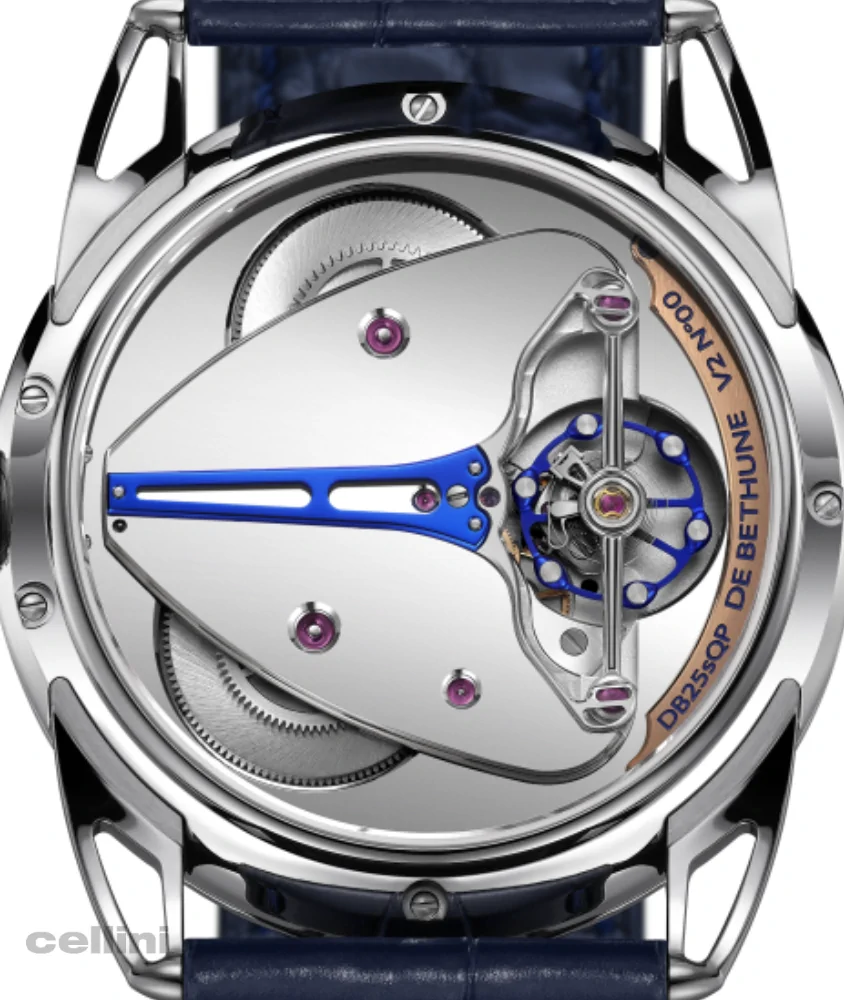 Entirely developed in the workshops at L’Auberson, the DB2 005V3 notably features a perpetual calendar; a spherical moon indicating the phases of the moon with a degree of corresponding to a one day deviation in 122 years; a self precision regulating double barrel; a titanium/white gold balance wheel; a “De Bethune” balance spring with flat terminalcurve; a silicon escape wheel and a triple pare chute shock absorbing system.