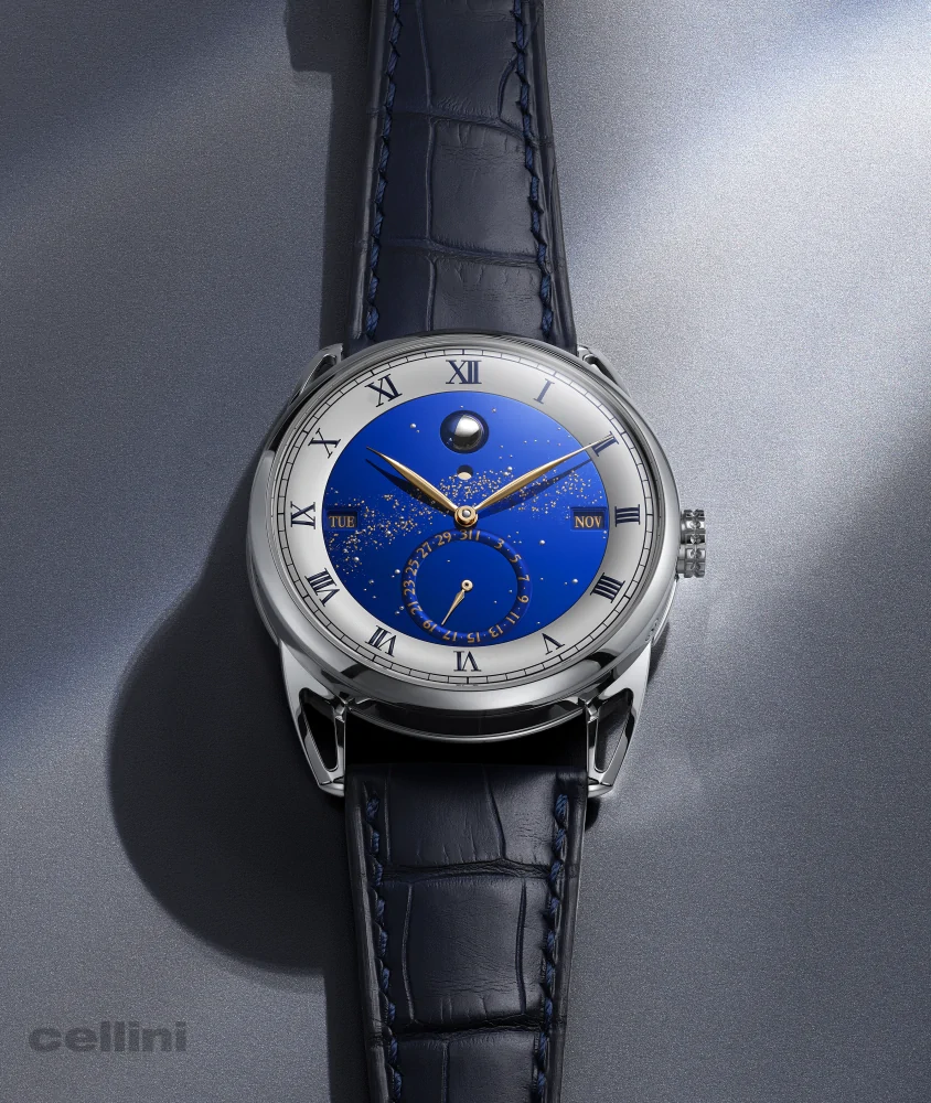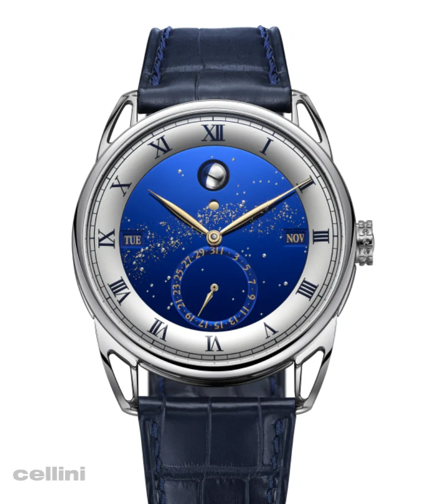 The perpetual calendar is displayed against a backdrop of a starry sky and the Milky Way. The display is based on a multi level architecture consisting of ring appliques circling the subdials and a silver–shaped toned minutes track. The date is positioned at 6 o’clock, while the day and month apertures are located at 9 o’clock and 3 o’clock respectively. At 12 o’clock, a palladium/blued steel sphere displays the moon phases.