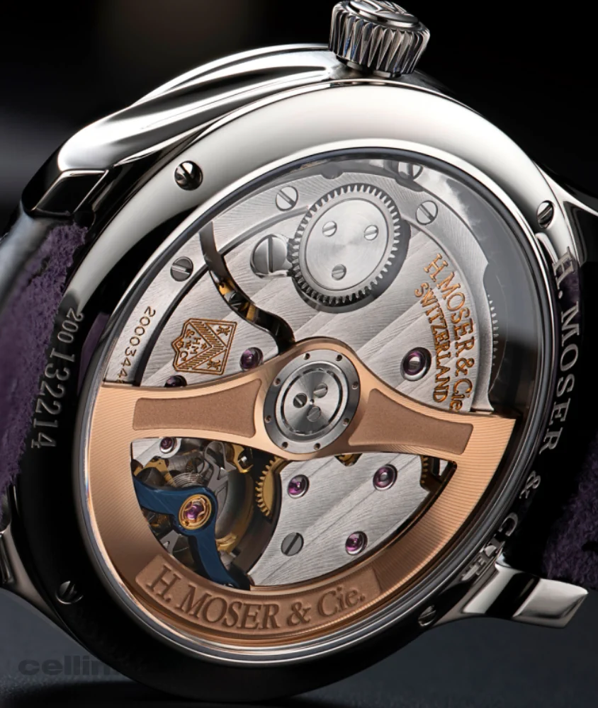 - Movement: A special version of H. Moser & Cie.’s HMC 200 automatic manufacture movement, the blue balance bridge signifies the double hairspring, consisting of two identical balance springs that beat in opposite directions to counter any external effect on the escapement.