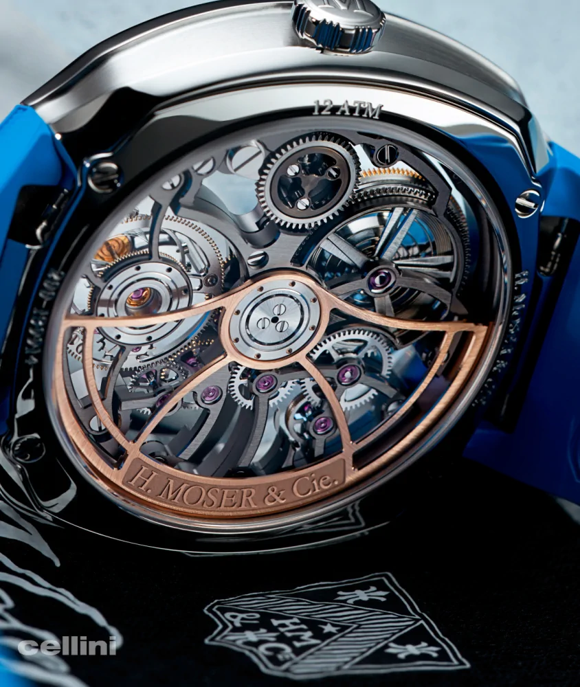 Positioned at 6 o’clock is a one-minute flying tourbillon fitted with a cylindrical hairspring shaped by hand. At 12 o’clock, the skeletonised main dial is topped with a small translucent domed dial, sporting the signature blue colour of H. Moser & Cie. and Alpine Motorsports. The indices feature Super-Luminova®, while the inserts which top the hour and minute hands are made in Globolight®.