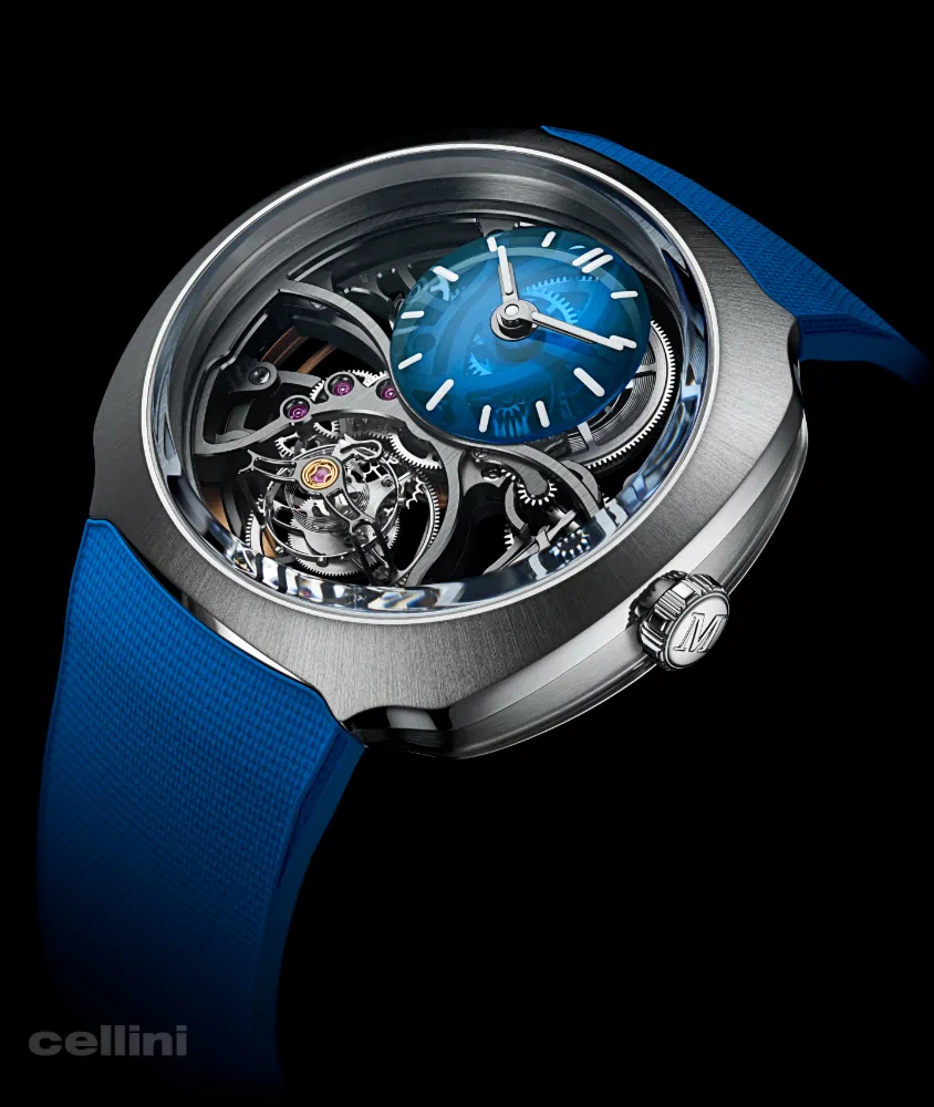 The Streamliner Cylindrical Tourbillon Skeleton Alpine Limited Edition, a collaboration with Alpine Motorsports. A design attuned to the aesthetic tastes of the stable’s F1 drivers and endurance racing team: fine engineering visible from every angle, bold character, touch of colour, and a blue moulded rubber strap which imitates the texture of a textile strap. A fully chiselled three-dimensional sculptural watch, which looks spectacular and is perfect for everyday wear thanks to its balanced proportions and 12 ATM water resistance.