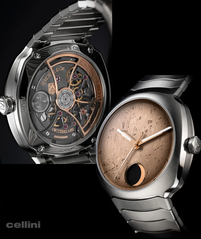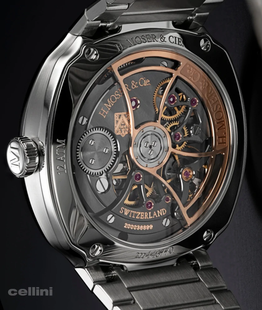 - Strap/Bracelet: Integrated steel bracelet. Folding clasp with three steel blades, engraved with the Moser logo. Half-links available