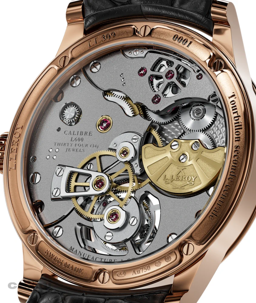 Inside: L.Leroy L600 automatic calibre (Geneva) with micro-rotor; 288 components; 21,600 vph (3 Hz); 60-hour power reserve. An integrated Inermet micro-rotor keeps the movement slim while maximising winding efficiency. The flying tourbillon rotates once per minute in a 78-part cage, topped by a mirror-polished grade 5 titanium bridge. Finishing: perlage mainplate; frosted rhodium bridges with polished bevels; mirror-polished screws; gilded micro-rotor with raised logo. A sapphire caseback reveals the movement, framed by matching-metal engravings.