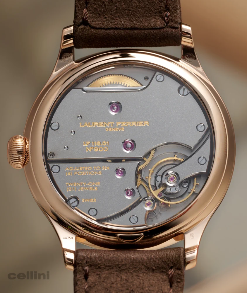 Beneath the sapphire case back lies the LF116.01 calibre, a manually wound movement. At its center, a screw balance comes to life, guided by a Breguet-type over coil hairspring and the signature long-blade ratchet pawl. Once fully wound, the watch offers a power reserve of over 80 hours. The bridges are adorned with a sandblasted finish and treated in black rhodium, while every edge is hand polished. In contrast, the mirror-polished screws gleam like points of light. Every component is hand-finished within the workshop.