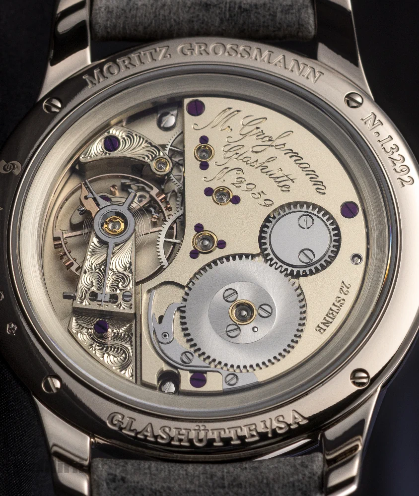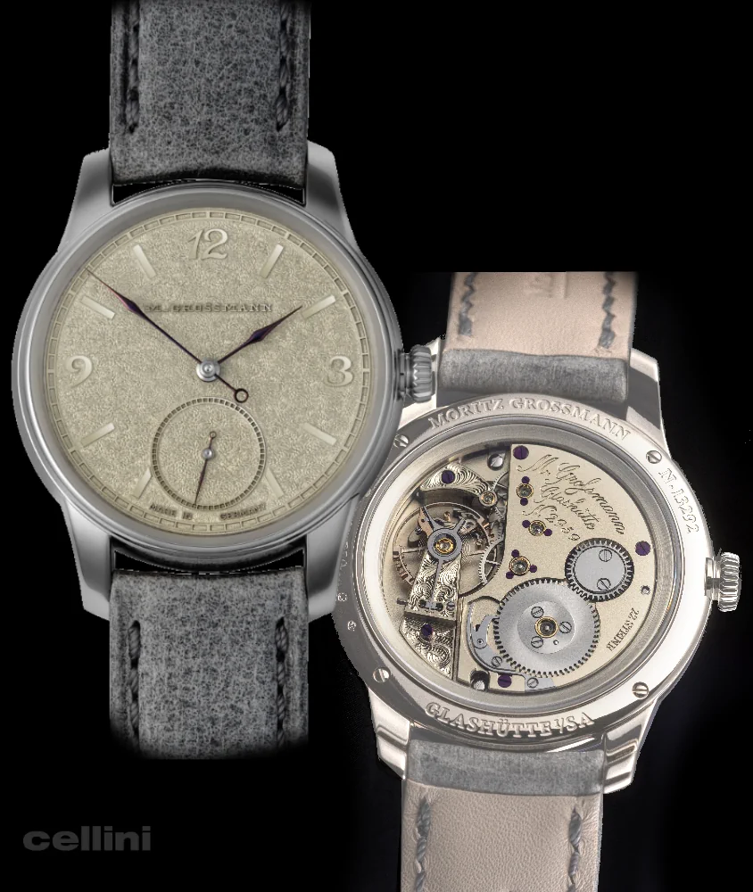 Thanks to the surface treatment, the German silver alloy produces a silver-like hue with an aesthetic vintage look. The three-dimensional appearance of the dial underscores the effect: The numerals of the hours and circular small seconds rise above the surface, as does the historic “M. Grossmann” logo from 1875, which goes back to Moritz Grossmann. These are not mounted appliqués. The base of the dial has been cut out and removed so that the logo, numerals and seconds circle remain. A task that also requires meticulous care to create clean edges. After this the dial undergoes the painstaking tremblage process. A single dial can take an engraver several days to complete. The result is exquisite!