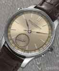 This new, white gold version of the Benu Date is styled to appear like a glittering, impeccably cared for, antique masterpiece. The deep champagne hues of the two-tone lacquered dial give this piece masculine elegance. On this background, the brown-violet hands and brown date numerals, minute scale, and the seconds subdial look as if they have sat there for years. The entire display is tone-on-tone except for the bright white-gold hour markers which pop to form an elegant contrast that echoes the case.