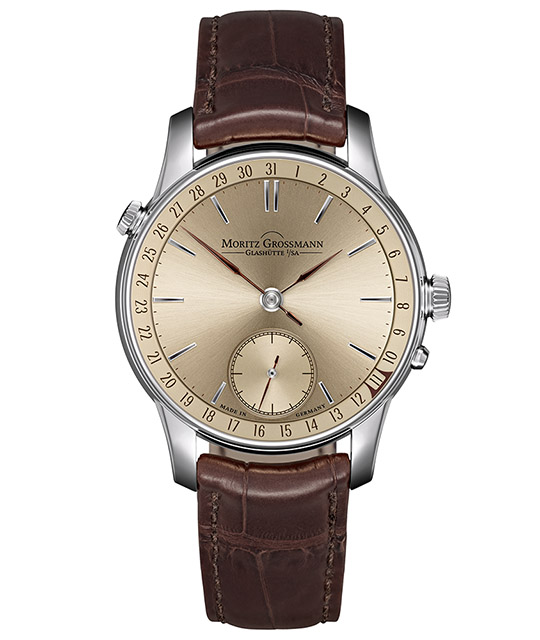 The date indication, a complication coveted and often discussed by watch enthusiasts, is a comparatively recent development in the long history of precision watchmaking. The first wristwatches with an analog date were only just introduced in the early 20th century. For their date display in the Benu Date, Grossmann’s watchmakers adopted this classic format as well. A full date scale and an unusually shaped bracket marker emphasize the elegance and functionality of the model family. The jumping date combines a precisely legible display with mechanical ingenuity and a rare degree of convenience.