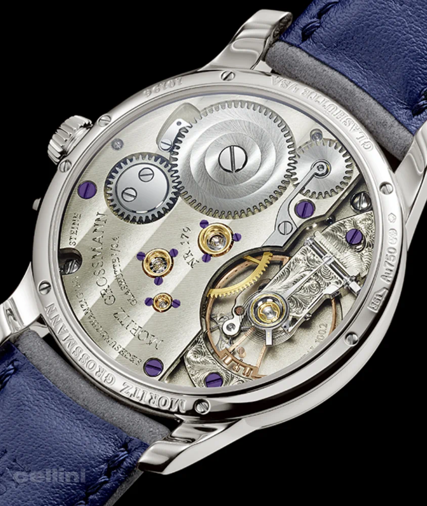The watch is powered by the calibre 100.2, an enhanced version of the calibre 100.1. It includes a Grossmann manual winder with a pusher, a cantilevered balance cock with micrometer screw.