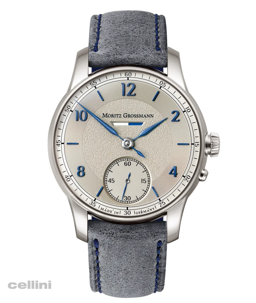 The new Moritz Grossmann BENU Power Reserve features a refreshed dial with Azurage decoration, a circular pattern of ultra-thin grooves that reflect light. The dial has a silver shimmer (argenté), blue appliqué numerals and indices, and manually crafted, blue-tempered steel hands with a slight curve and fine tip.