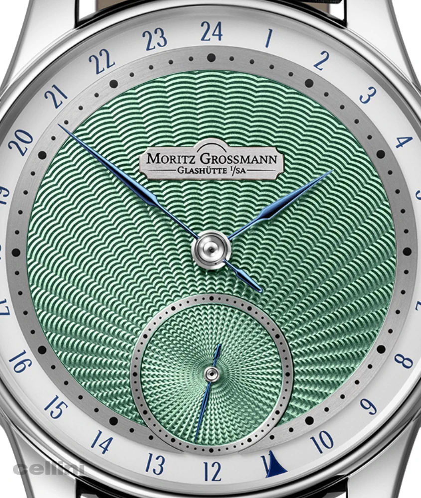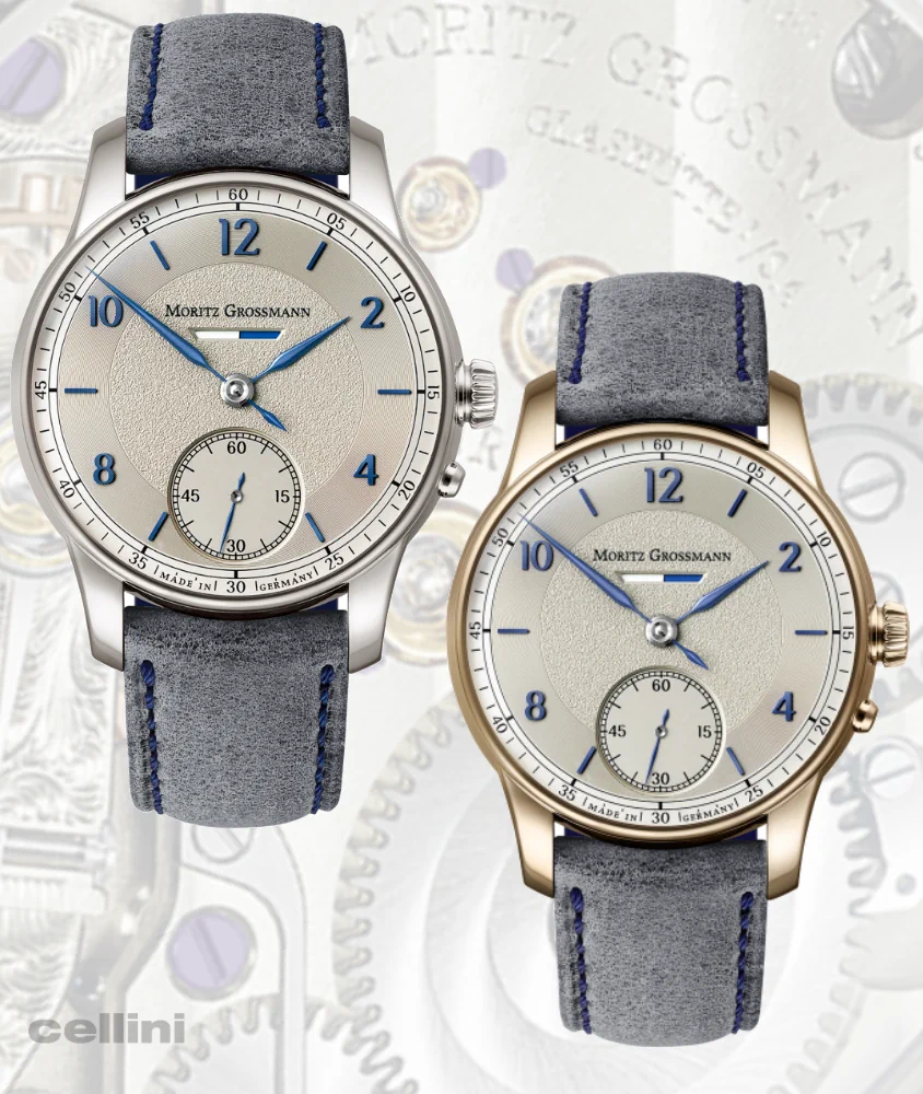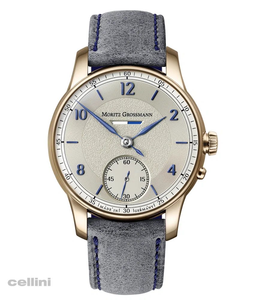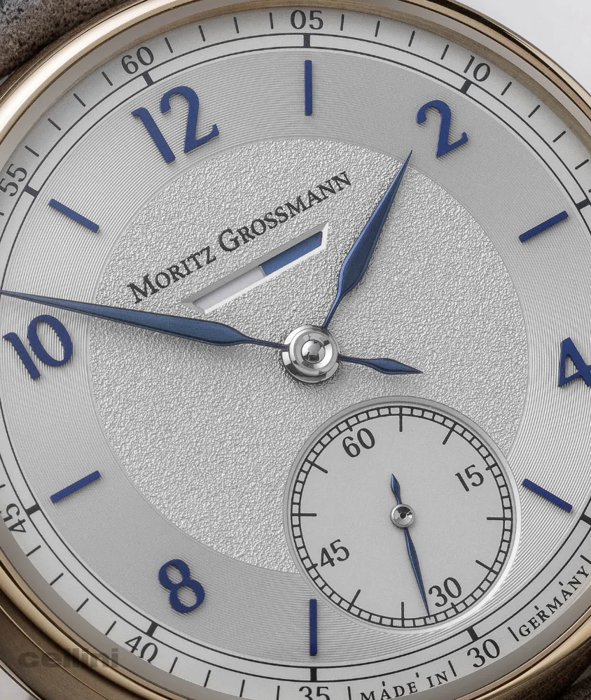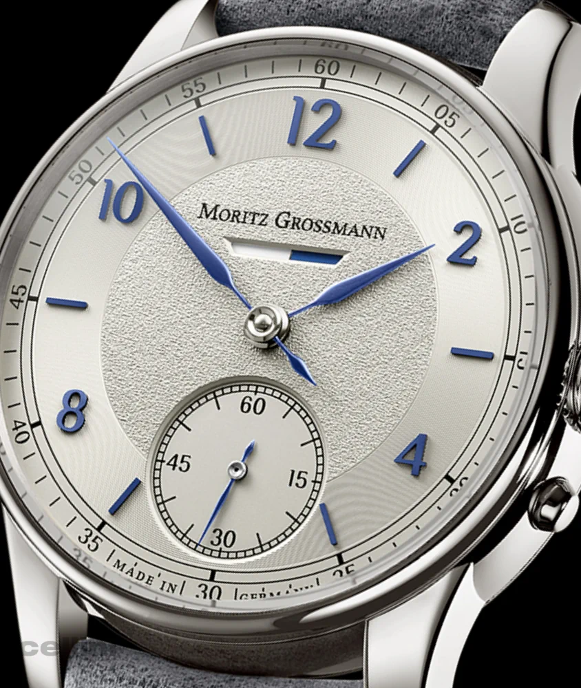 The new Moritz Grossmann BENU Power Reserve features a refreshed dial with Azurage decoration, a circular pattern of ultra-thin grooves that reflect light. The dial has a silver shimmer (argenté), blue appliqué numerals and indices, and manually crafted, blue-tempered steel hands with a slight curve and fine tip.