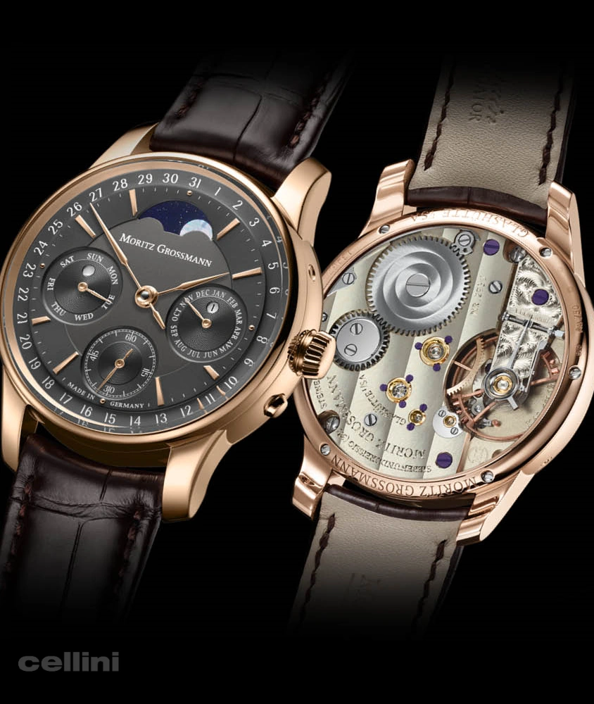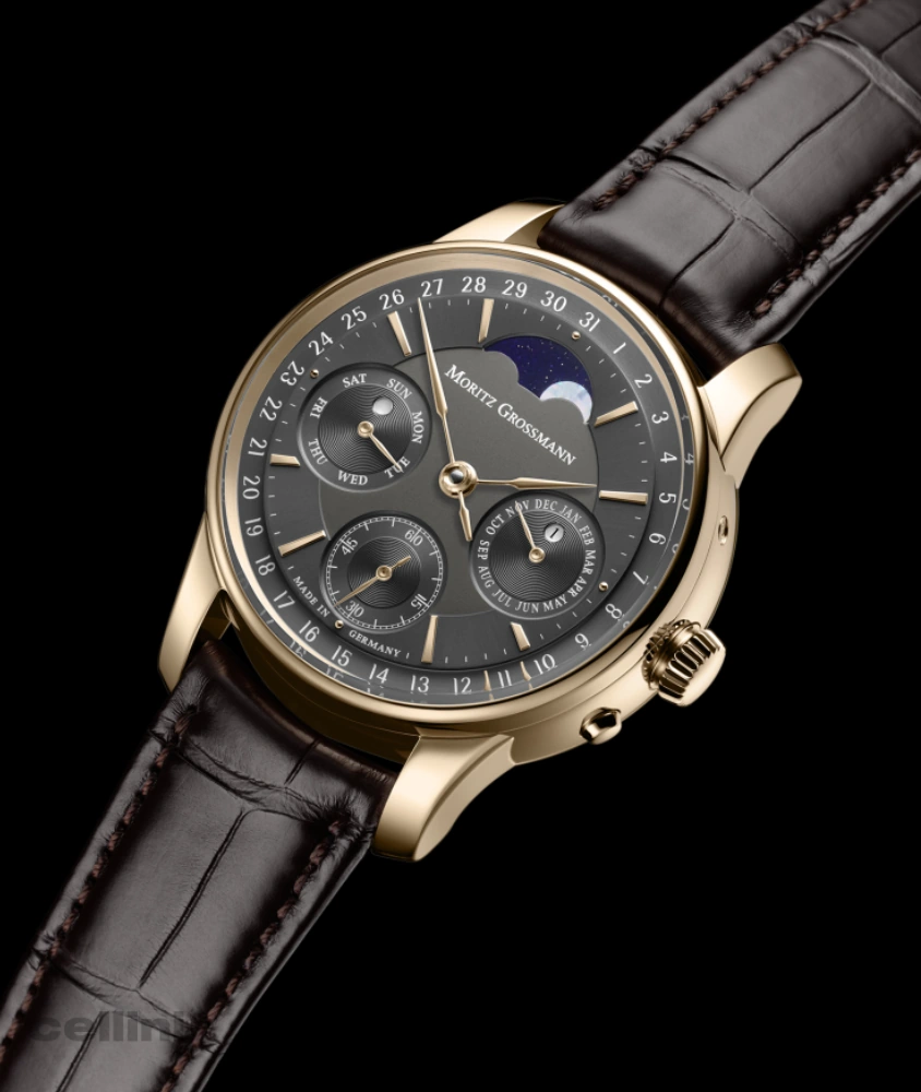 - Function: Hours and minutes, small seconds with stop-second function, date, day of week, month, moon phase, Grossmann manual winder with pusher