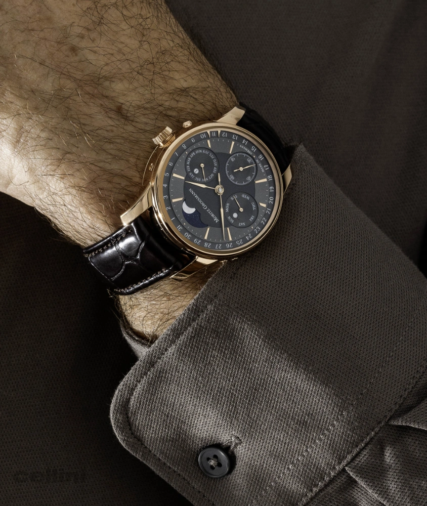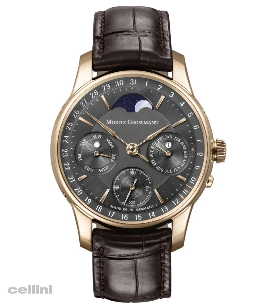 Moritz Grossmann celebrates its 17th anniversary with a PERPETUAL CALENDAR in three variants. Two models sport a rose gold case with slim, lance-shaped hands made of rose gold. One model features a gleaming silver argenté dial whilst the other has a vibrant anthracite dial. The third is presented in a platinum case with a dial combining argenté and anthracite colors. Powering these Perpetual Calendars is the newly engineered 101.13 hand-wound calibre. All three watches are worn on a dark brown alligator leather strap with a prong buckle.