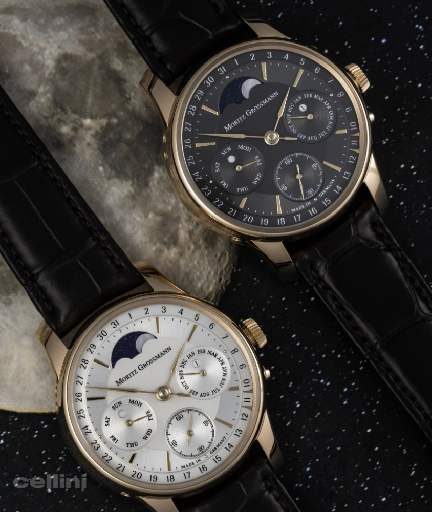 Moritz Grossmann celebrates its 17th anniversary with a PERPETUAL CALENDAR in three variants. Two models sport a rose gold case with slim, lance-shaped hands made of rose gold. One model features a gleaming silver argenté dial whilst the other has a vibrant anthracite dial. The third is presented in a platinum case with a dial combining argenté and anthracite colors. Powering these Perpetual Calendars is the newly engineered 101.13 hand-wound calibre. All three watches are worn on a dark brown alligator leather strap with a prong buckle.