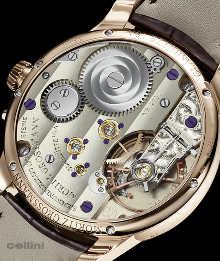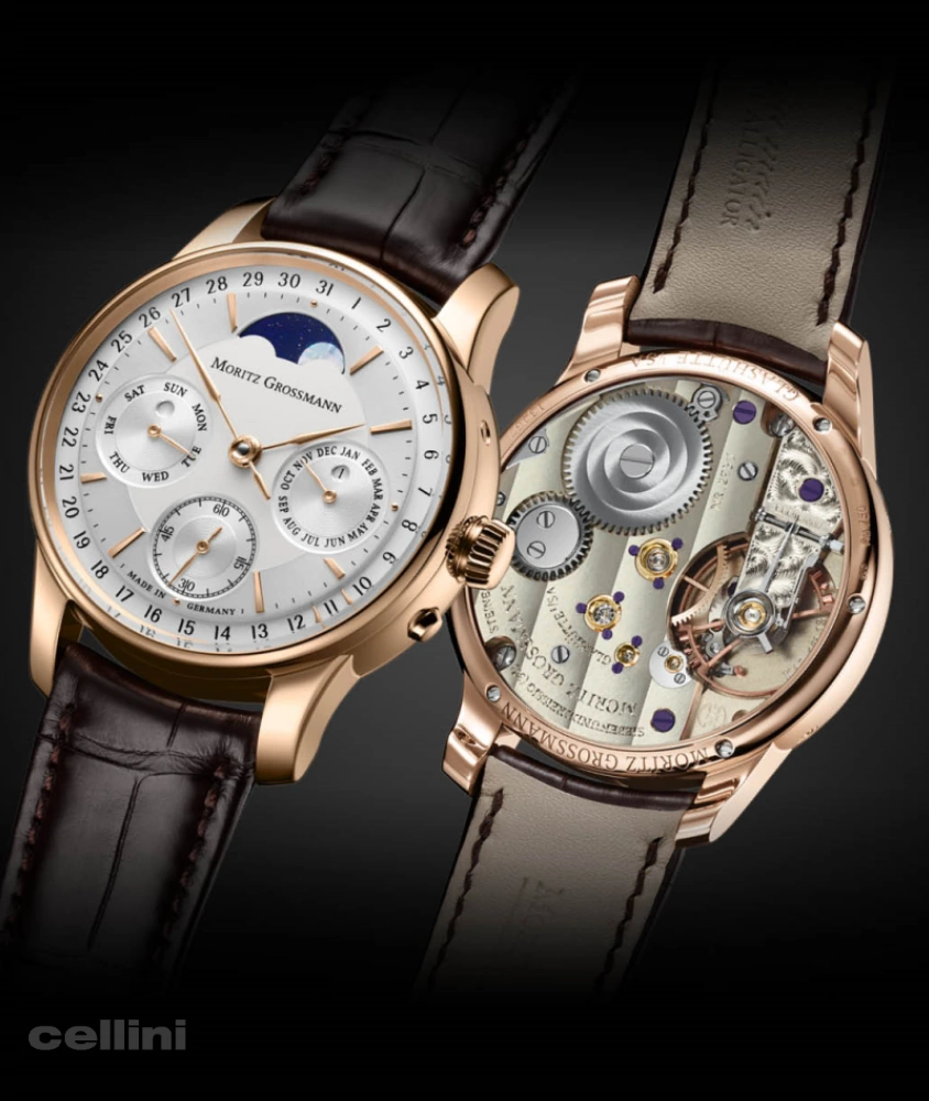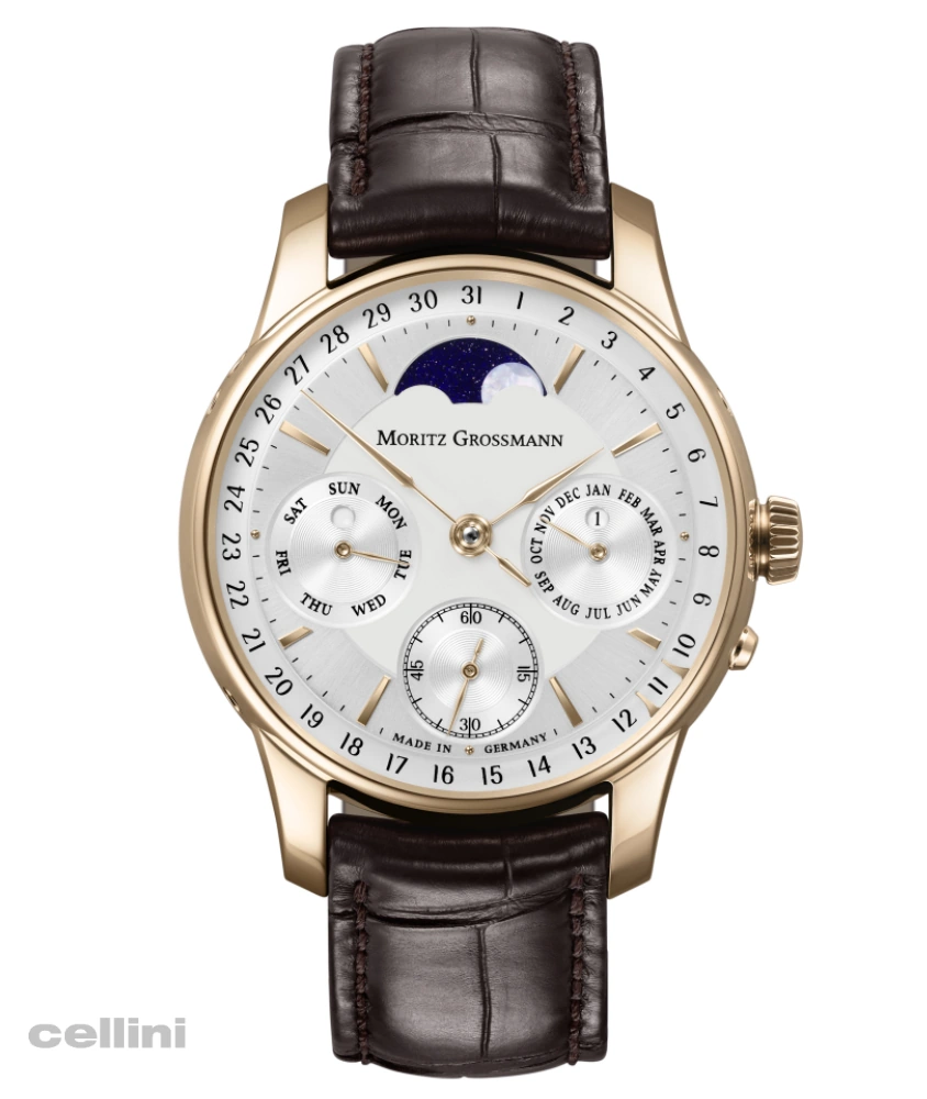 - Function: Hours and minutes, small seconds with stop-second function, date, day of week, month, moon phase, Grossmann manual winder with pusher