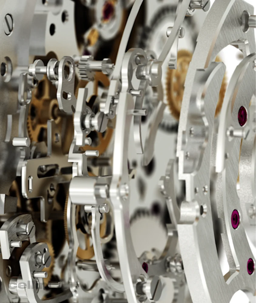 When activated, the chronograph unfolds across the entire dial. A monopusher at 7:30 activates the sequence. One press starts the measurement. A second stops it. A third resets and makes it disappear. Five hands, perfectly superimposed at rest, separate only when needed, before returning to a single, silent reading. At the heart of this transformation lies a unique architecture: five coaxial hands driven by a triple-clutch system — one vertical, two horizontal.