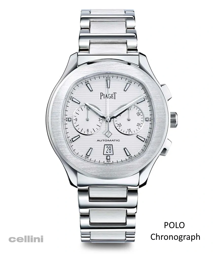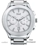 This steel chronograph watch is the expression of relaxed elegance, perfect for any occasion. Its 42 mm diameter case is water-resistant to 10 ATM and combines round and cushion shapes in the pure aesthetic tradition of Piaget, featuring a polished and satin-finish bracelet with folding clasp.