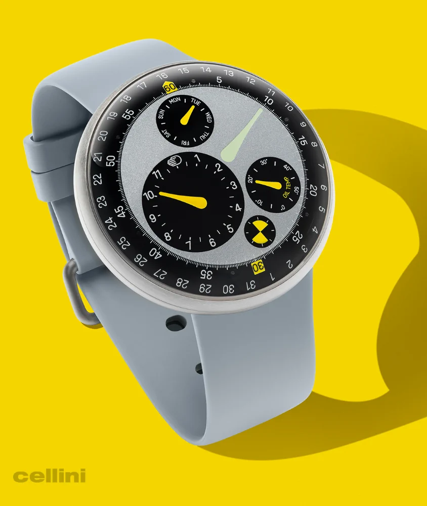 The color palette draws on subtle yet striking hues of celadon green, grey, black, and vibrant yellow, delivering visual clarity. The dial features Grade 5 titanium discs with four eccentric biaxial satellites inclined at varying degrees, including a runner disc. Engraved indications are filled with blue and green Grade A Super-LumiNova®, ensuring legibility in all lighting conditions.