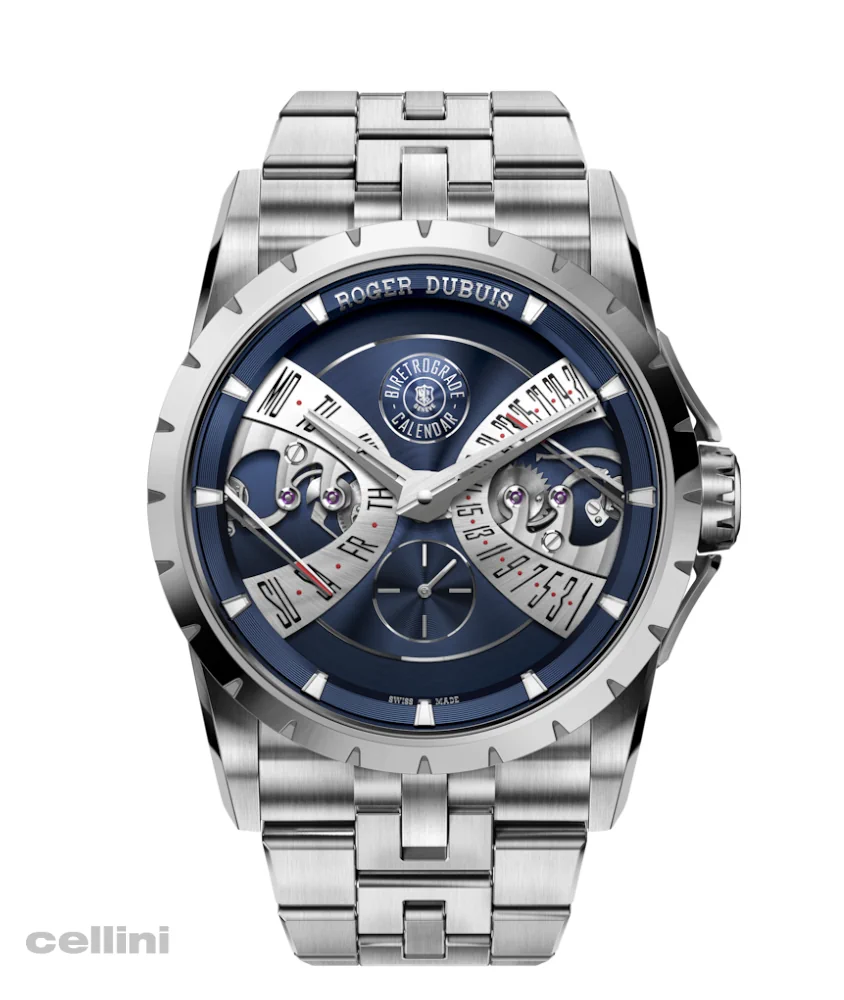 The Excalibur Biretrograde Calendar Cosmic Blue is presented with the esteemed excellence of Poinçon de Genève certification.