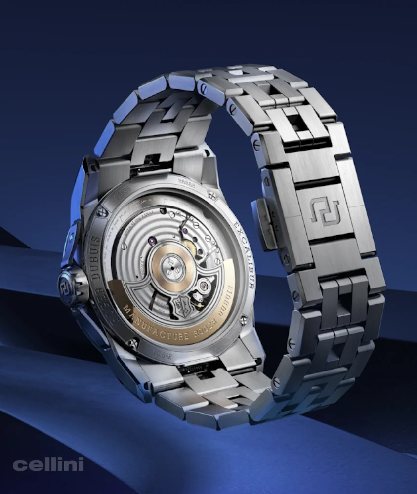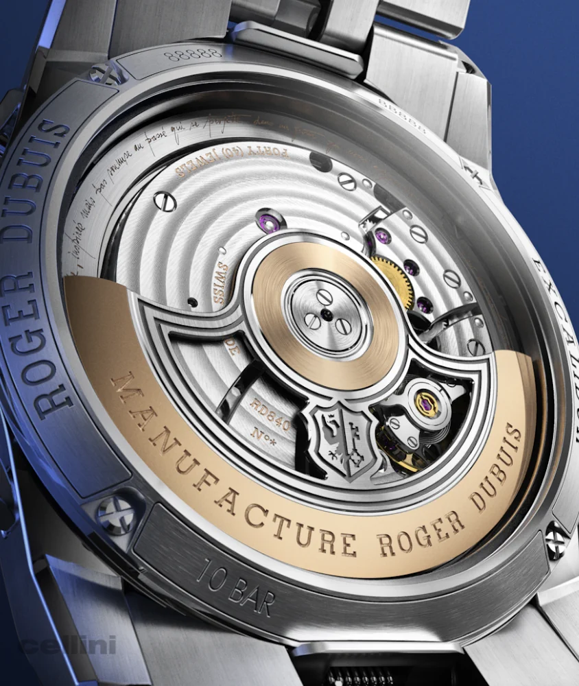 As a lasting tribute to the Roger Dubuis co-founders, a quotes appears on a ring beneath the sapphire glass. “C’est une montre actuelle, inspirée mais pas soumise au passé, qui se projette dans un futur qui nous appartient.” In translation, “This is a watch of today, inspired but not restricted to the past, projected into a future that belongs to us.”