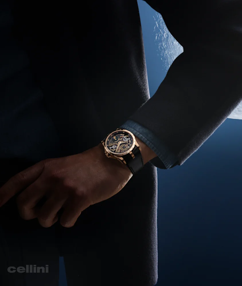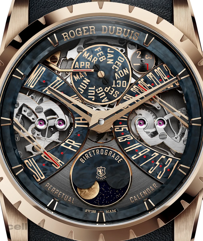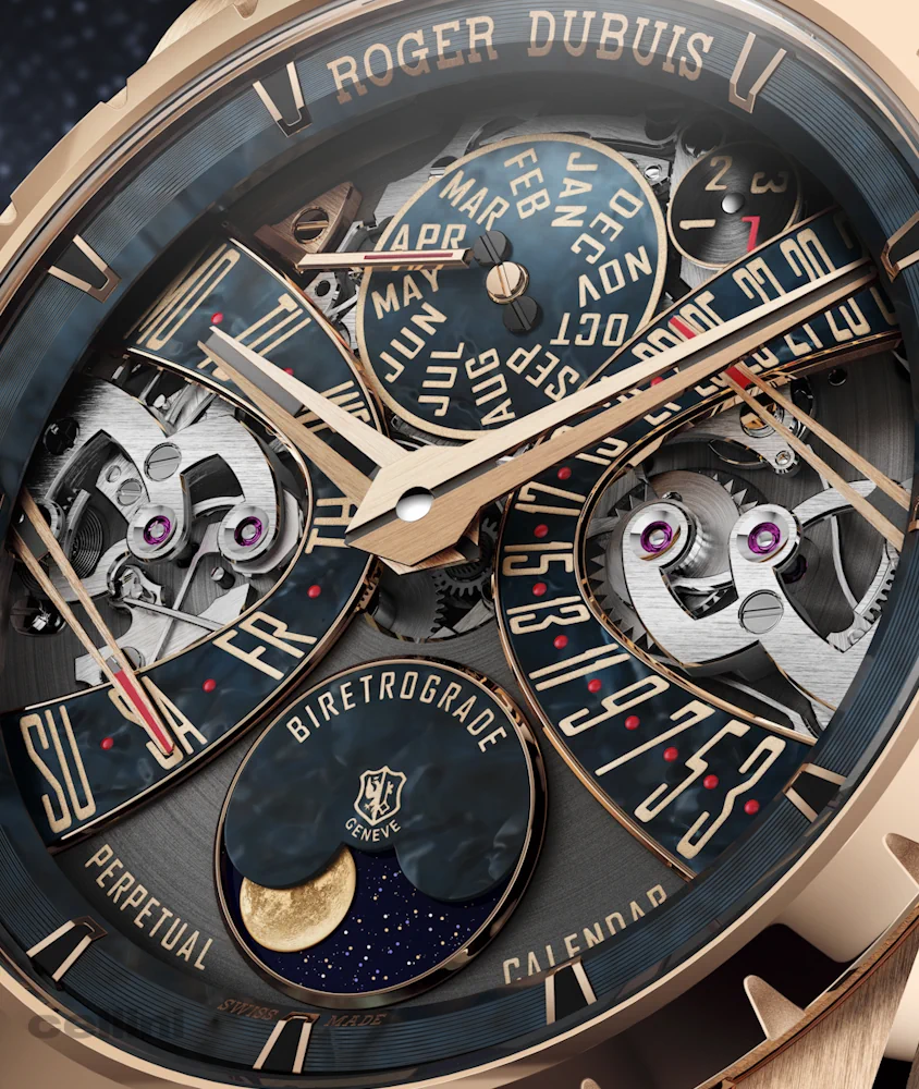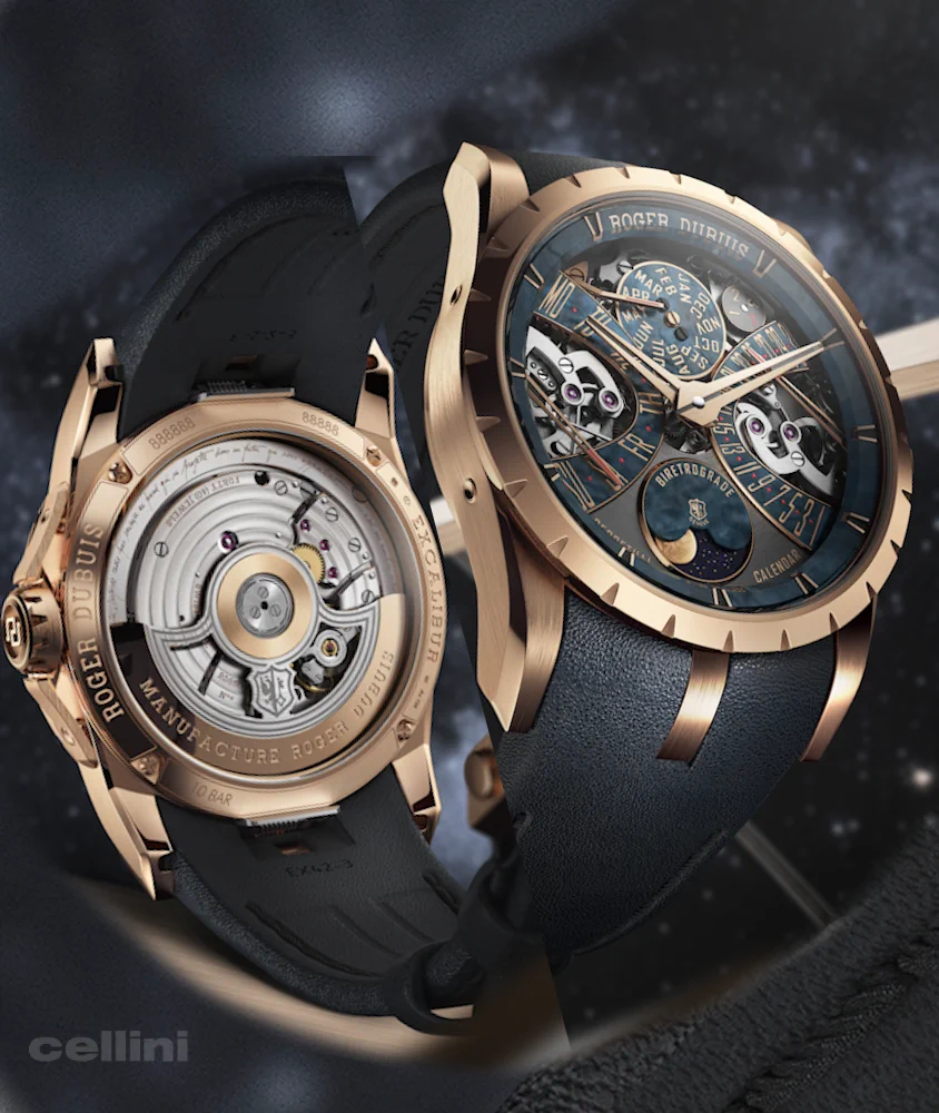 The Excalibur Biretrograde Perpetual Calendar unites celestial inspiration with Roger Dubuis’ Genevan watchmaking mastery. This creation tracks earthly time while displaying the Moon’s phases, expressing the Maison’s distinctive aesthetics through an upgraded in‑house calibre.