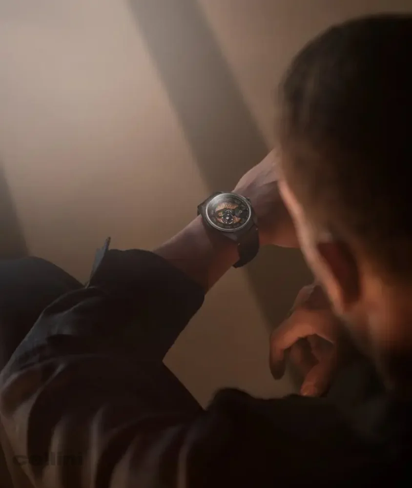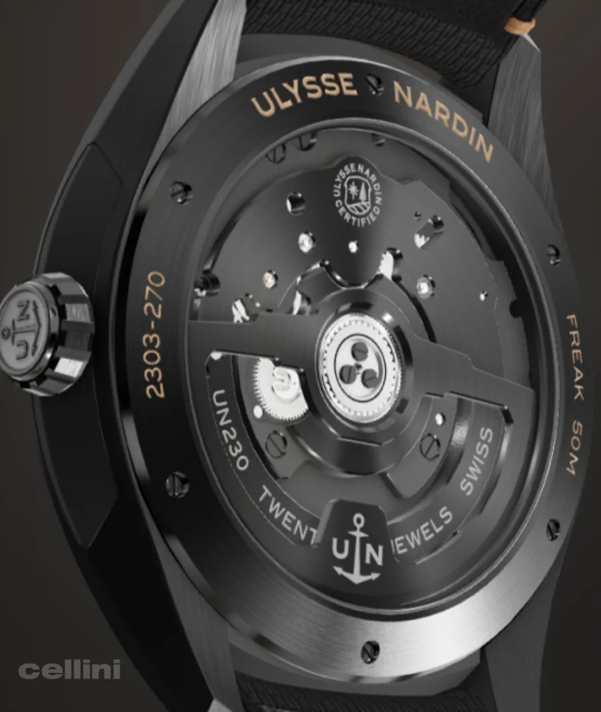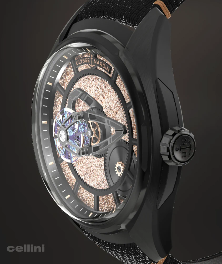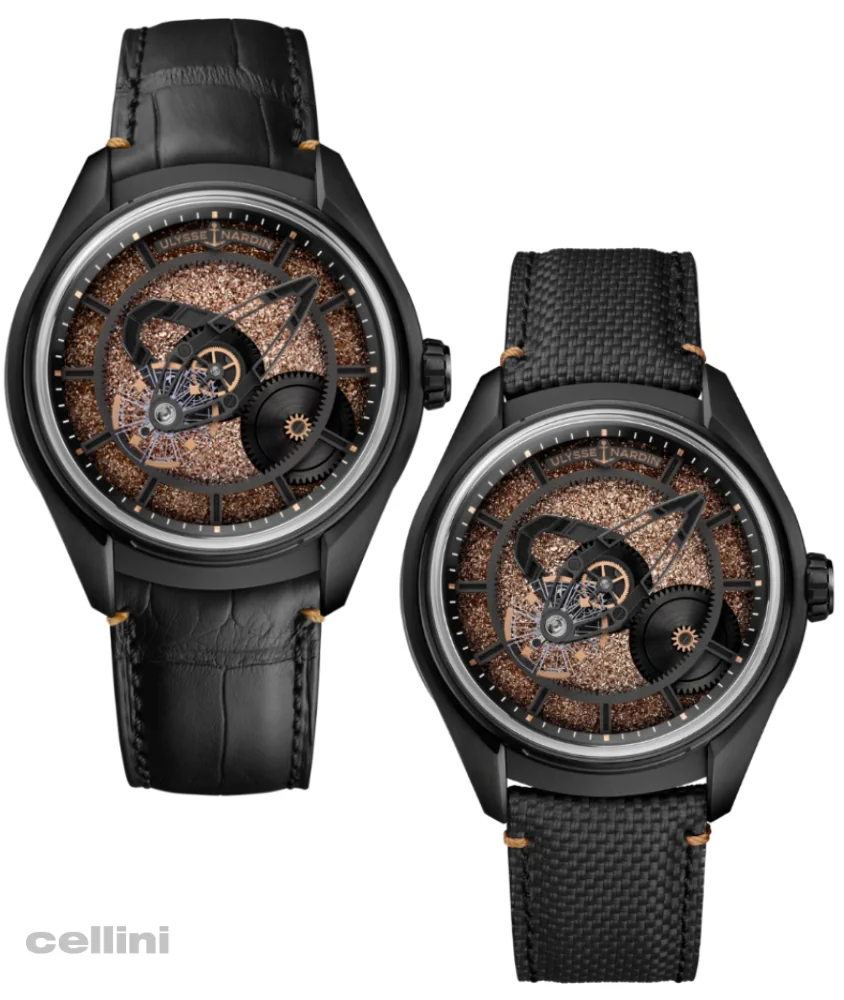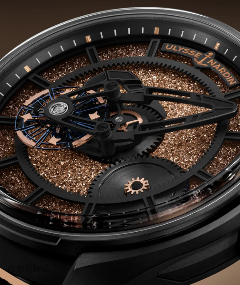 Inside and clearly visible beats the automatic calibre UN-230, featuring a flying carrousel with a super-light balance wheel in silicium and escapement—crafted entirely in-house at Ulysse Nardin’s dedicated silicon lab, SIGATEC. Both components are suspended by a bridge that functions as the minute hand, completing a full rotation every hour.