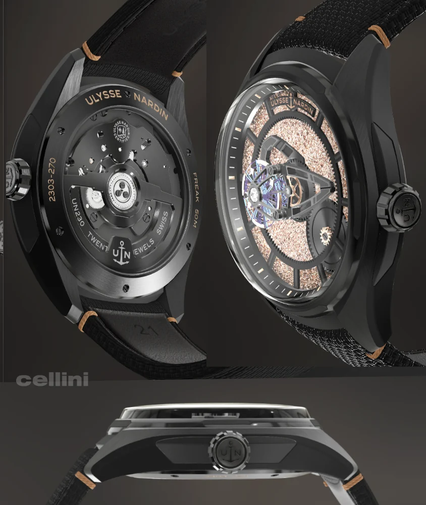 The Freak X Crystalium is housed in a black DLC-coated titanium case, with a matching bezel, black hour indicator, and minute bridge. It is paired with a ballistic-textured black rubber strap (2303-270-4A/3A) or Black Leather (2303-270-4A/1A) .