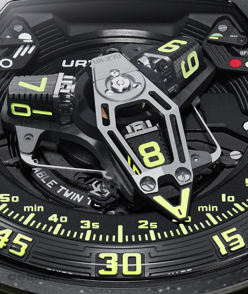 - Dial: Wandering hours on a revolving satellite complication (URWERK patented); 3D retrograde minute hand; Air brake system for winding regulation; Automatic winding on/off indicator.