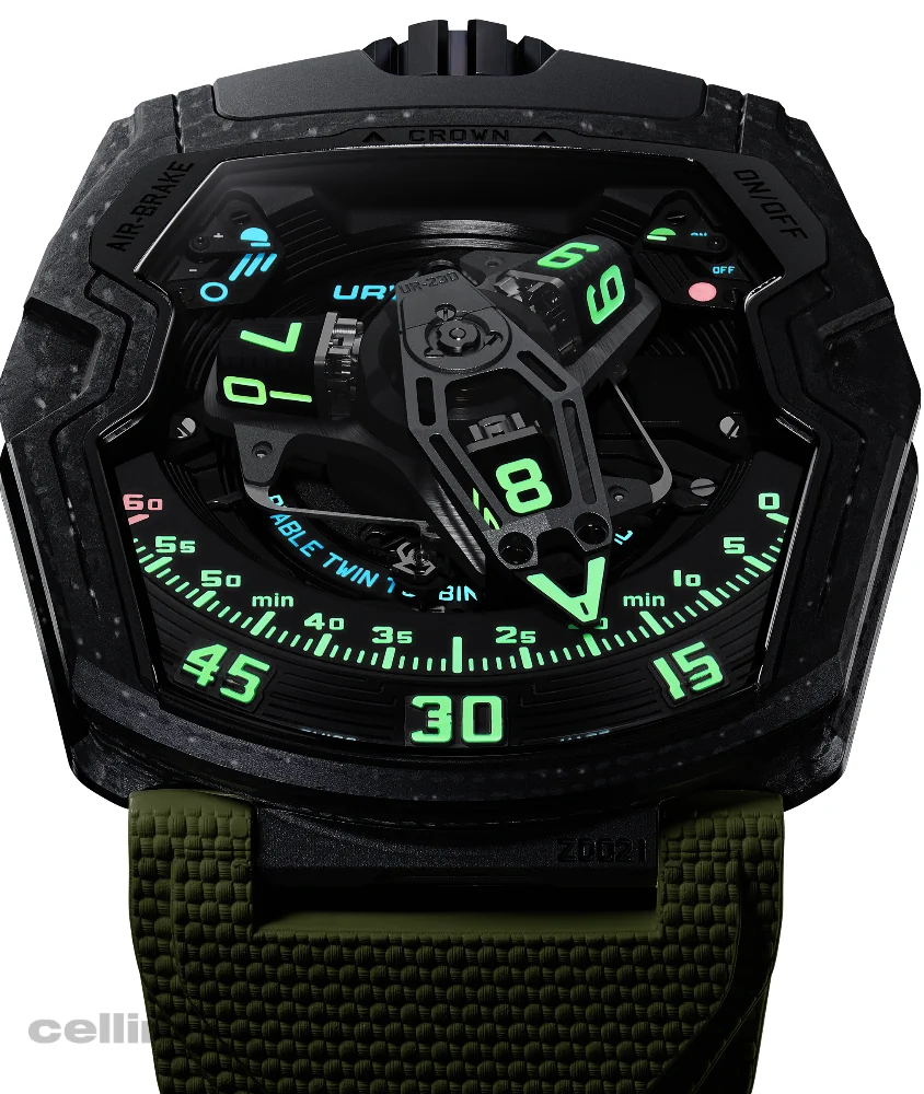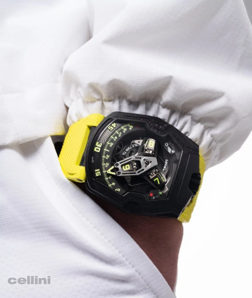 Inside the case, the UR-7.30 caliber is encased in a hermetically sealed container resembling a strongbox. The ceramic case and black DLC titanium case back are harnessed to a Vulcanized rubber strap around it.