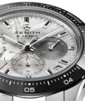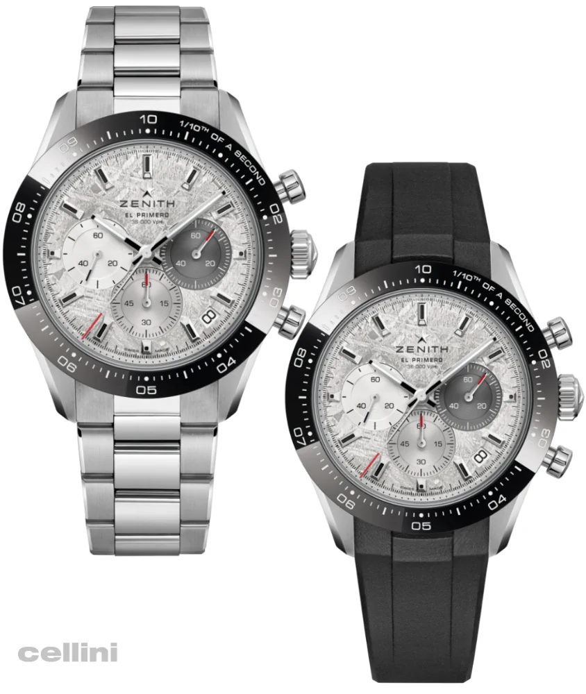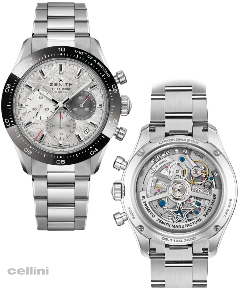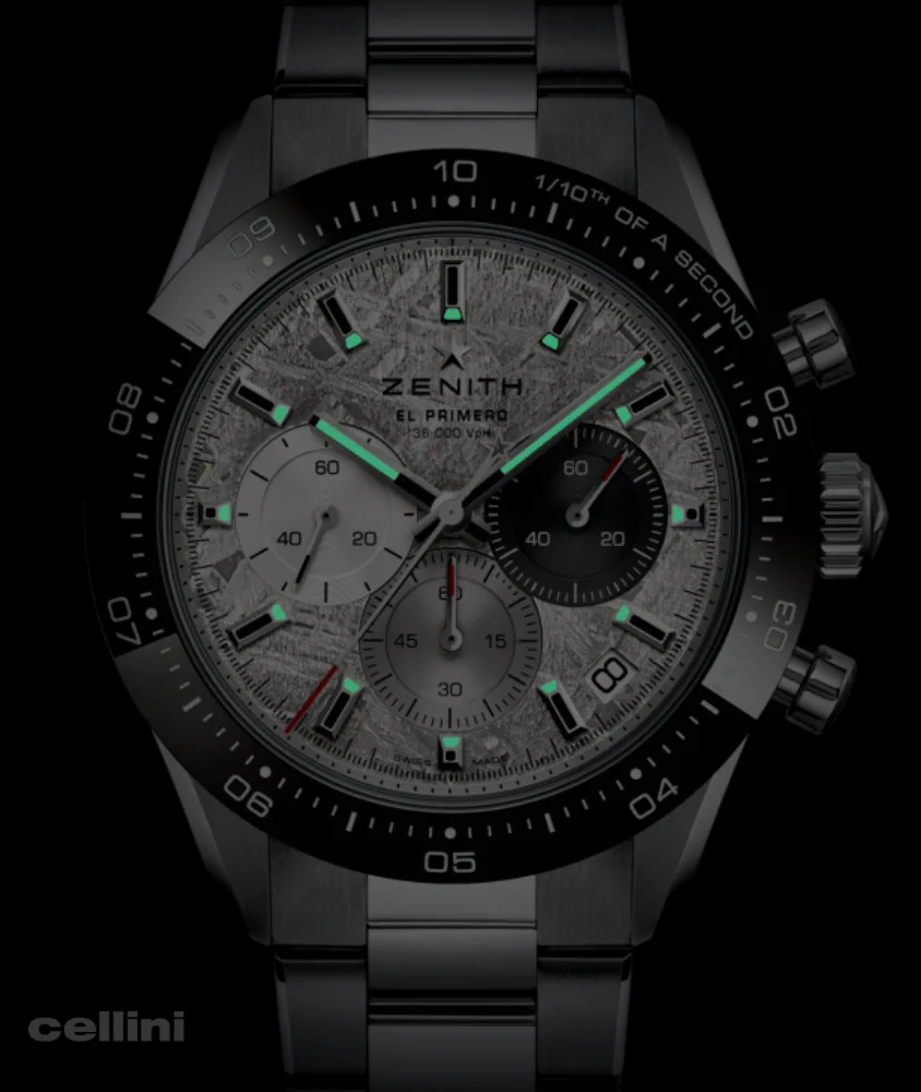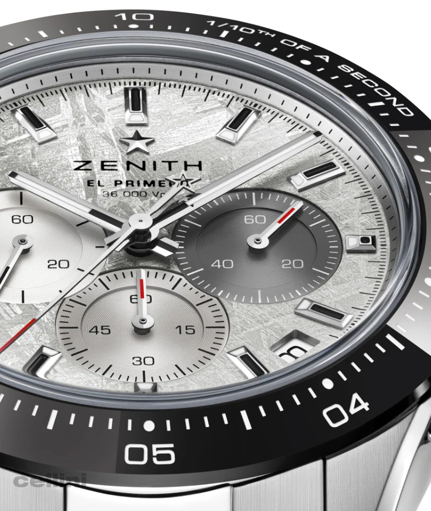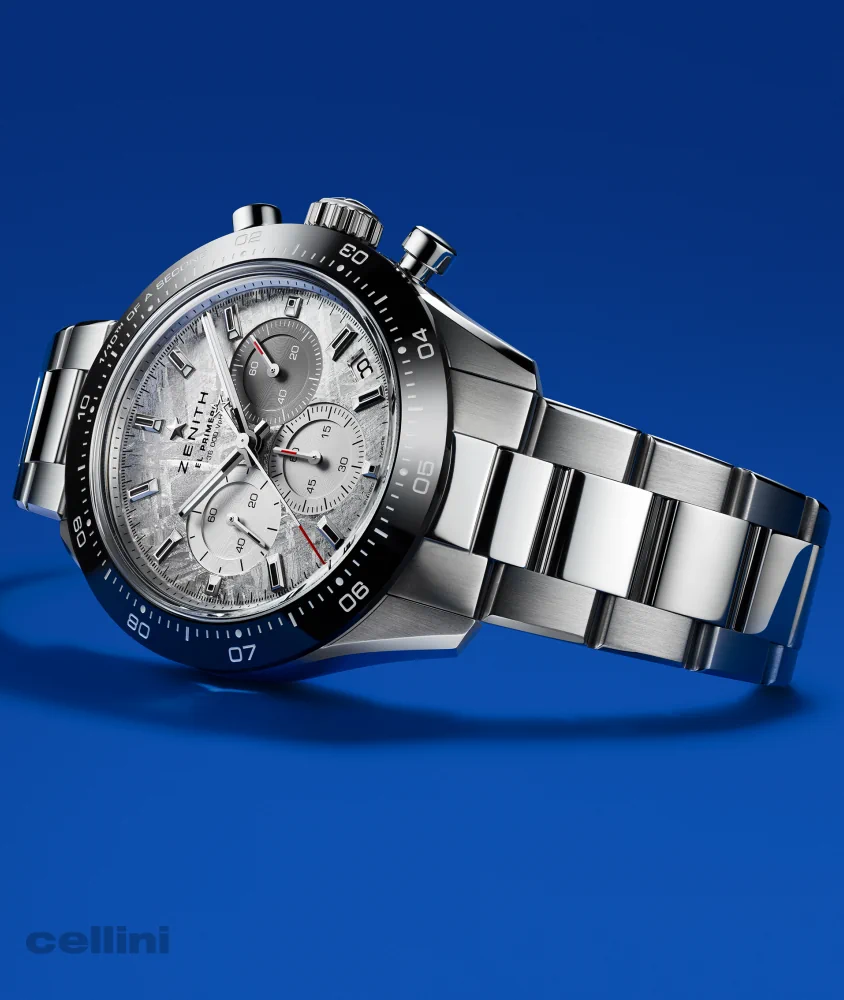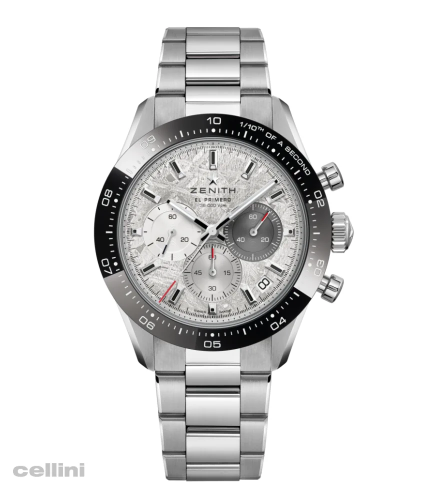 Meticulously hand-finished to reveal the unique Widmanstätten pattern, a naturally occurring geometric structure formed by the slow cooling of molten iron in space, the grey meteorite dial is never replicated, never repeated. Against this galactic canvas, ZENITH’s signature tri-color counters in silver, light grey, and anthracite provide a harmonious contrast, each detailed with a circular azuré finish. Applied baton-style hour markers and hands, treated with C1 Super-LumiNova, ensure legibility in any light. A date window at 4:30 completes the display. Encased in a 41mm stainless steel case, its black ceramic bezel, graduated over 10 seconds, offers both durability and precise readability, while water resistance up to 10 ATM ensures everyday resilience.