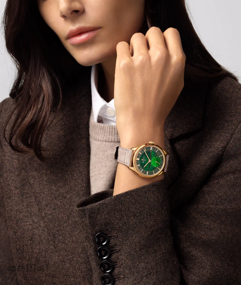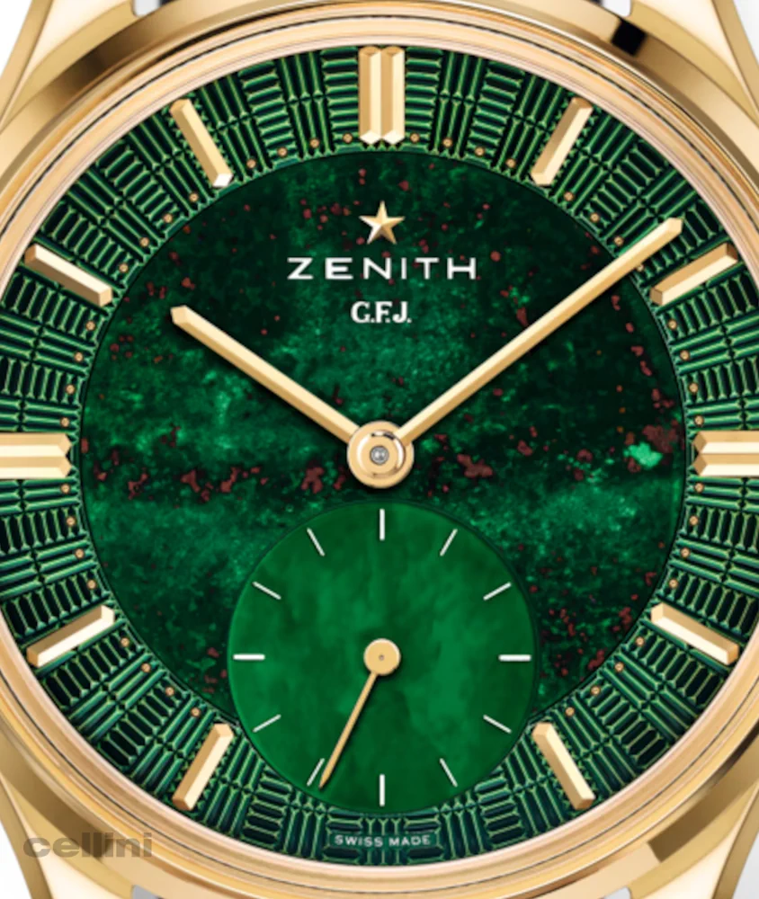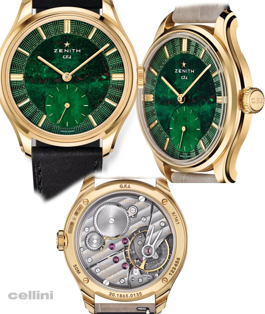 The ZENITH G.F.J. comes with three different straps: a beige nubuck alligator strap, a green alligator strap and a black calfskin strap.